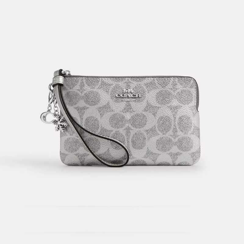 Coach コーナージップリストレット 真珠色の署名によって塗られるキャンバスおよびcrossgrainの革 シルバー/グレー